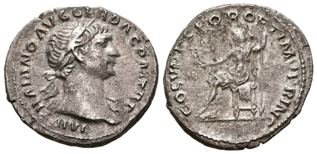 TRAJANO. Denario. (Ar. 3,25g/20mm). 108-109 d.C. Roma. (RIC 116). Anv: Cabeza laureada de Trajano a derecha, alrededor leyenda: IMP TRAIANO AVG GER DAC P M TR P. Rev: Roma sentada a izquierda portando lanza y portando Victoria con corona de laurel, alrededor leyenda: COS V P P SPQR OPTIMO PRINC. MBC.
