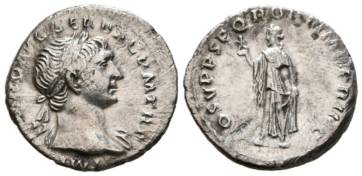 TRAJANO. Denario. (Ar. 2,53g/19mm). 107-108 d.C. Roma. (RIC 127). Anv: Cabeza laureada de Trajano a derecha, alrededor leyenda: IMP TRAIANO AVG GER DAC P M TR P. Rev: Spes avanzando a izquierda portando flor, alrededor leyenda: COS V P P SPQR OPTIMO PRINC. MBC.