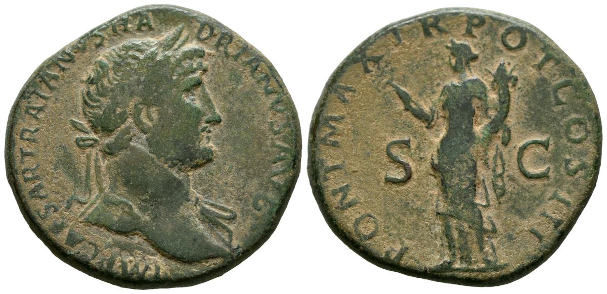 ADRIANO. Sestercio. (Ae. 23,25g/34mm). 119 d.C. Roma. (RIC 244). Anv: Busto laureado de Adriano a derecha con drapeado sobre hombro izquierdo, alrededor leyenda: IMP CAESAR TRAIANVS HADRIANVS AVG. Rev: Felicitas estante a izquierda portando caduceo y cornucopia, entre: S-C, alrededor leyenda: PONT MAX TR POT COS III. MBC-.