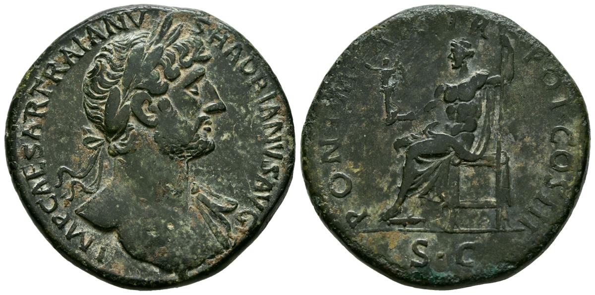 ADRIANO. Sestercio. (Ae. 24,24g/33mm). 119-120 d.C. Roma. (RIC 249). Anv: Busto laureado de Adriano a derecha con drapeado sobre hombro izquierdo, alrededor leyenda: IMP CAESAR TRAIANVS HADRIANVS AVG. Rev: Júpiter sentado a izquierda portando cetro y Victoria con corona de laurel, en exergo: SC, alrededor leyenda: PONT MAX TR POT COS III. MBC+.