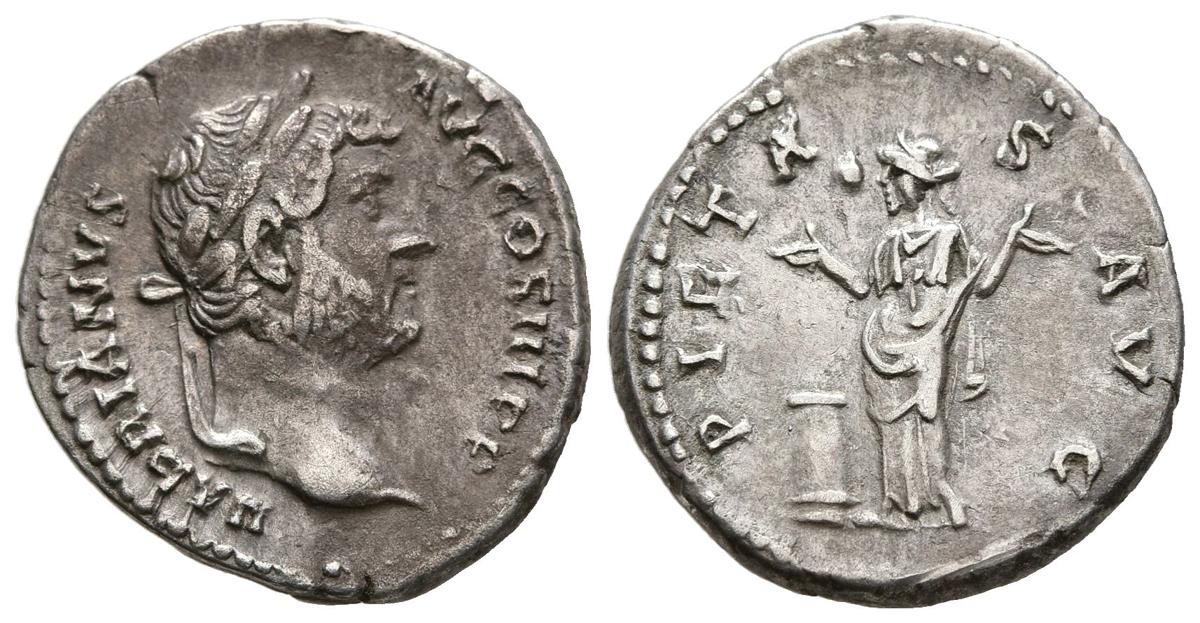 ADRIANO. Denario. (Ar. 3,15g/18mm). 133-135 d.C. Roma. (RIC 257). Anv: Cabeza laureada de Adriano a derecha, alrededor leyenda: HADRIANVS AVG COS III P P. Rev: Pietas estante a izquierda alzando ambas manos y delante altar, alrededor leyenda: PIETAS AVG. MBC+.