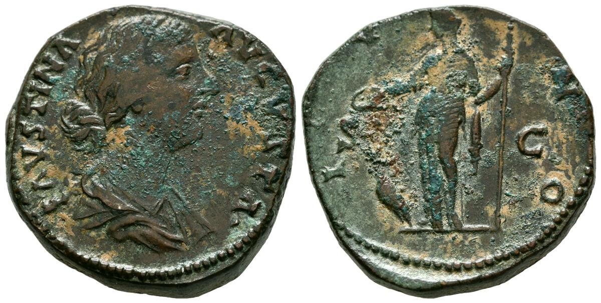 FAUSTINA II. Sestercio. (Ae. 28,43g/30mm). 161-176 d.C. Roma. (RIC 1645). Anv: Busto drapeado de Faustina II a derecha, alrededor leyenda: FAVSTINA AVGVSTA. Rev: Juno estante a izquierda portando patera y cetro, delante pavo real, entre: S-C, alrededor leyenda: IVNO. MBC.