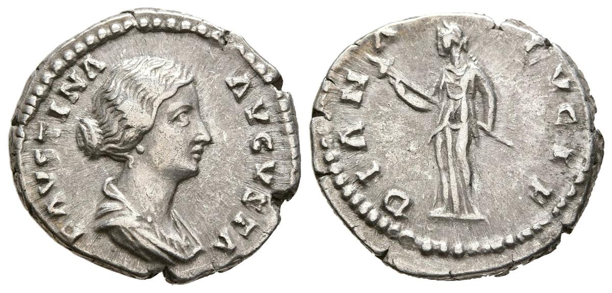 FAUSTINA II. Denario. (Ar. 3,30g/18mm). 161-164 d.C. Roma. (RIC 674). Anv: Busto drapeado de Faustina II a derecha, alrededor leyenda: FAVSTINA AVGVSTA. Rev: Diana estante a izquierda portando antorcha, alrededor leyenda: DIANA LVCIF. MBC+.