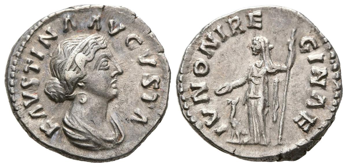 FAUSTINA II. Denario. (Ar. 3,10g/18mm). 164-165 d.C. Roma. (RIC 694). Anv: Busto drapeado de Faustina II a derecha, alrededor leyenda: FAVSTINA AVGVSTA. Rev: Juno estante a izquierda portando patera y cetro, a sus pies, pavo real, alrededor leyenda: IVNONI REGINAE. EBC-. Bonito ejemplar.