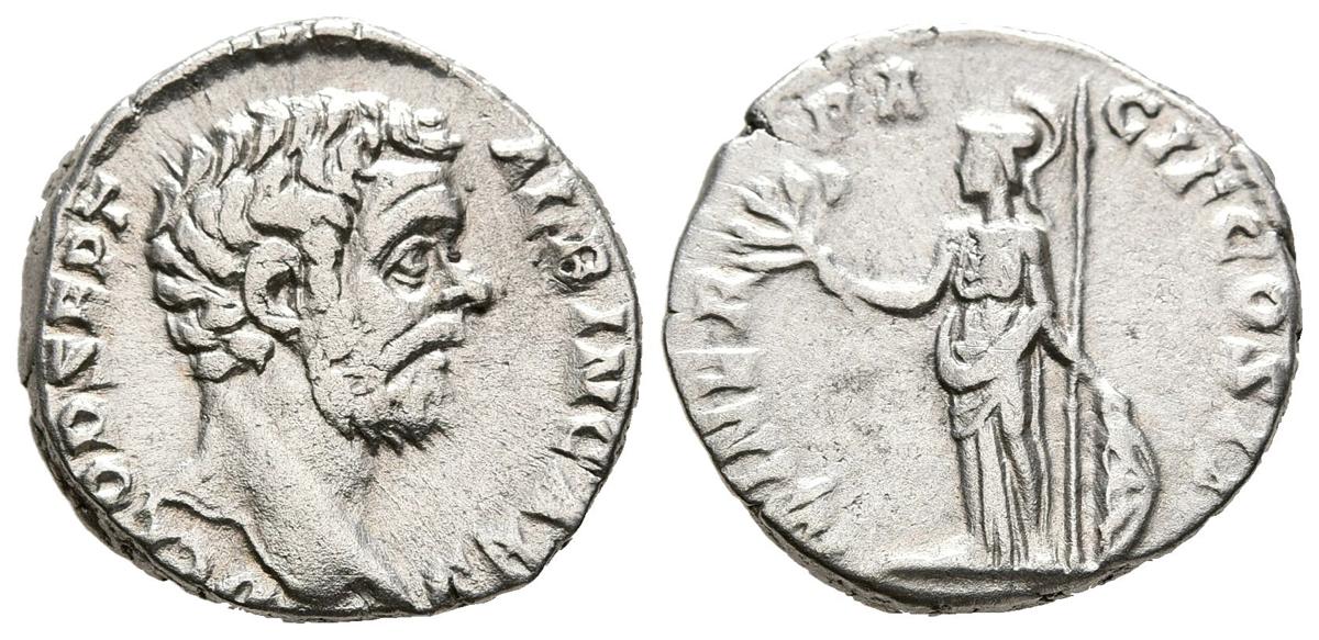 CLODIO ALBINO. Denario. (Ar. 3,30g/18mm). 194-195 d.C. Roma. (RIC 7). Anv: Cabeza de Clodio Albino a derecha, alrededor leyenda: D CLOD SEPT ALBIN CAES. Minerva estante a izquierda portando lanza con escudo y rama, alrededor leyenda: MINER PA CIF COS II. MBC.