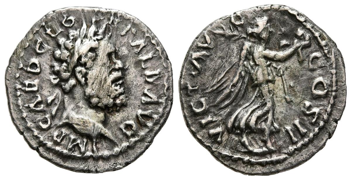 CLODIO ALBINO. Denario. (Ar. 3,04g/18mm). 195-197 d.C. Lugdunum. (RIC 43c). Anv: Cabeza laureada de Clodio Albino a derecha, alrededor leyenda: IMP CAES D CLO SEP ALB AVG. Rev: Victoria avanzando a derecha portando corona de laurel, alrededor leyenda: VICT AVG COS II. MBC. Escaso ejemplar.