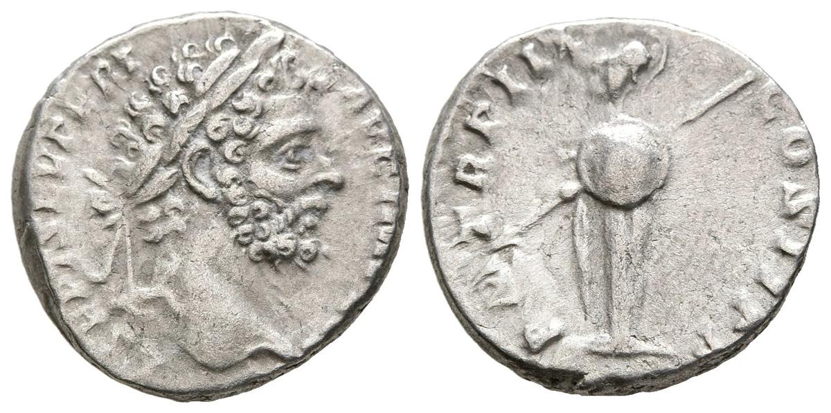 SEPTIMIO SEVERO. Denario. (Ar. 3,40g/17mm). 195 d.C. Roma. (RIC 53). Anv: Cabeza laureada de Septimio Severo a derecha, alrededor leyenda: L SEPT SEV PERT AVG IMP IIII. Rev: Minerva estante a izquierda portando escudo y lanza, alrededor leyenda: P M TR P III COS II P P. MBC.
