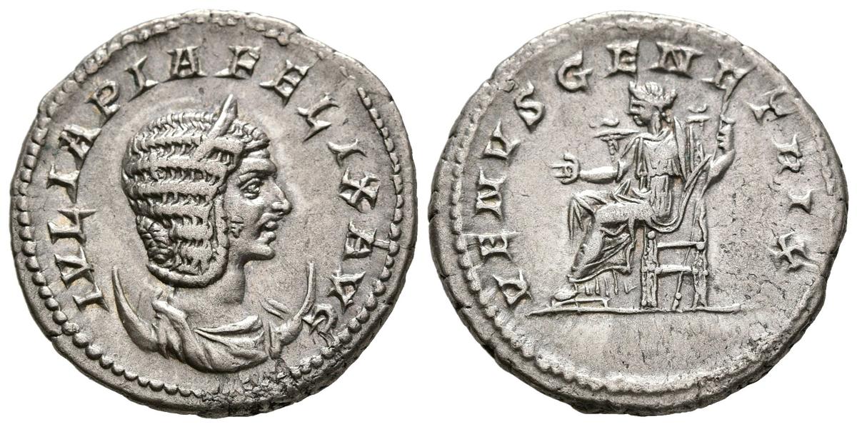 JULIA DOMNA. Antoniniano. (Ar. 4,92g/23mm). 215-217 d.C. Roma. (RIC 388a). Anv: Busto diademado y drapeado de Julia Domna a derecha sobre creciente, alrededor leyenda: IVLIA PIA FELIX AVG. Rev: Venus sentada a izquierda portando cetro y alzando mano derecha, alrededor leyenda: VENVS GENETRIX. MBC+. Bonito ejemplar.