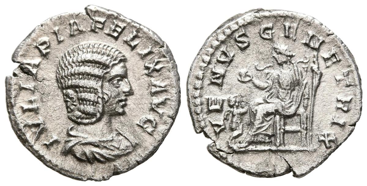 JULIA DOMNA. Denario. (Ar. 2,48g/18mm). 211-217 d.C. Roma. (RIC 389b). Anv: Busto diademado y drapeado de Julia Domna a derecha, alrededor leyenda: IVLIA PIA FELIX AVG. Rev: Venus sentada a izquierda portando manzana y cetro, delante Cupido a derecha, alrededor leyenda: VENVS GENETRIX. MBC+.