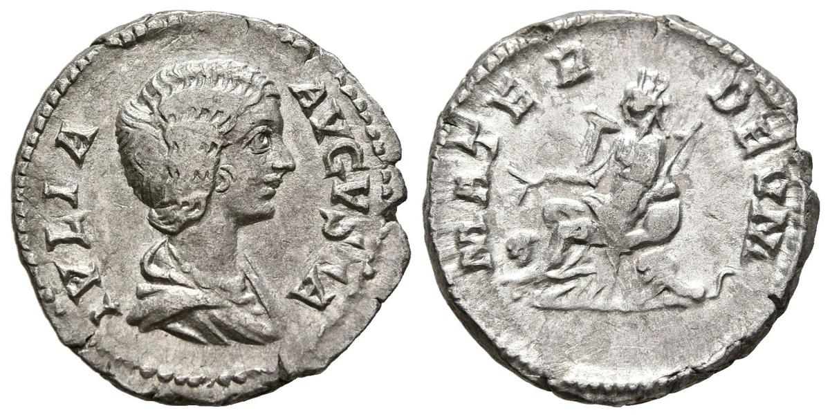 JULIA DOMNA. Denario. (Ar. 2,68g/19mm). 196-211 d.C. Roma. (RIC 564). Anv: Busto drapeado de Julia Domna a derecha, alrededor leyenda: IVLIA AVGVSTA. Rev: Cibeles portando rama sentada a izquierda en trono entre dos leones sentados, alrededor leyenda: MATER DEVM. MBC.