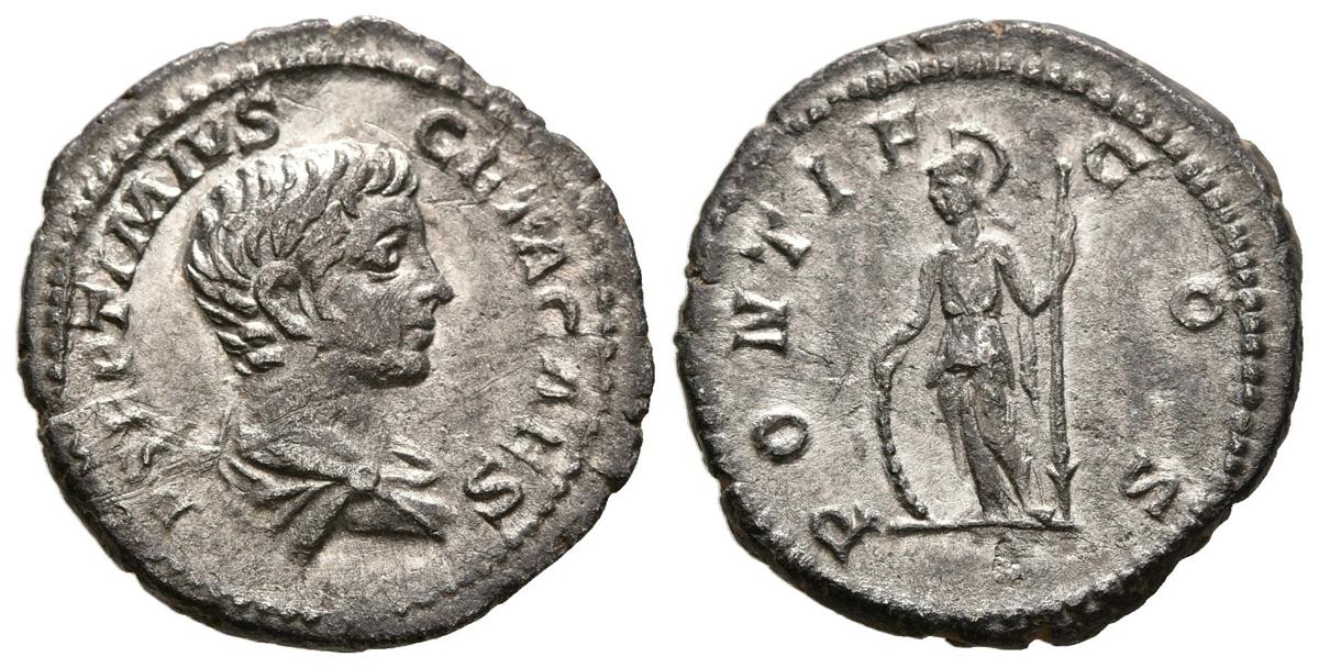 GETA. Denario. (Ar. 2,12g/19mm). 203-208 d.C. Roma. (RIC 34b). Anv: Busto drapeado de Geta a derecha, alrededor leyenda: P SEPTIMIVS GETA CAES. Rev: Minerva estante a izquierda portando lanza y escudo, alrededor leyenda: PONTIF COS. MBC.