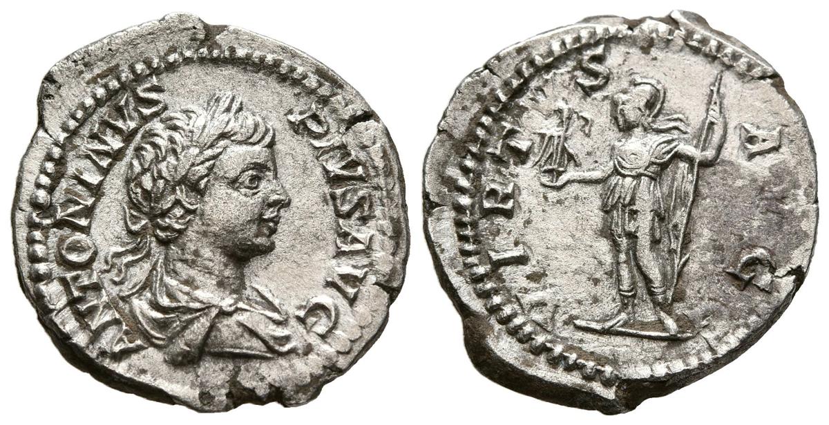 CARACALLA. Denario. (Ar. 3,34g/19mm). 201-210 d.C. Roma. (RIC 149a). Anv: Busto laureado y drapeado de Caracalla a derecha, alrededor leyenda: ANTONINVS PIVS AVG. Rev: Virtus estante a izquierda portando Victoria y lanza, alrededor leyenda: VIRTVS AVGG. MBC.