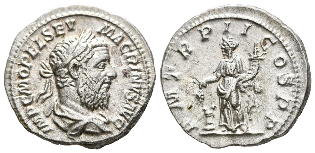 MACRINO. Denario. (Ar. 3,39g/19mm). 217 d.C. Roma. (RIC 26). Anv: Busto laureado y drapeado de Macrino a derecha, alrededor leyenda: IMP C M OPEL SEV MACRINVS AVG. Rev: Annona estante a izquierda portando espiga sobre modio y cornucopia, alrededor leyenda: P M TR P II COS P P. EBC.