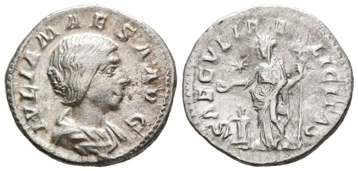 JULIA MAESA. Denario. (Ar. 2,79g/19mm). 218-222 d.C. Roma. (RIC 272). Anv: Busto drapeado de Julia Maesa a derecha, alrededor leyenda: IVLIA MAESA AVG. Rev: Felicitas estante a izquierda portando cetro sobre altar y cetro, en campo estrella, alrededor leyenda: SAECVLI FELICITAS. MBC.