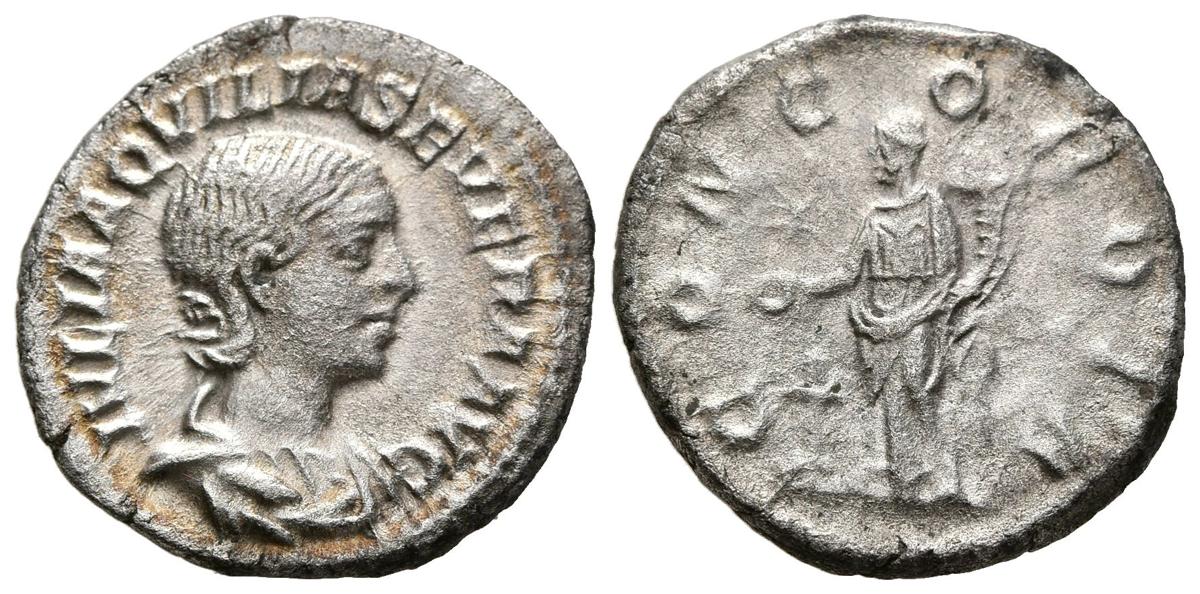 AQUILIA SEVERA. Denario. (Ar. 3,16g/19mm). 221-222 d.C. Roma. (RIC 225). Anv: Busto drapeado de Aquilia Severa a derecha, alrededor leyenda: IVLIA AQVILIA SEVERA AVG. Rev: Concordia estante a izquierda portando patera sobre altar y doble cornucopia, en campo estrella, alrededor leyenda: CONCORDIA. MBC/MBC-.