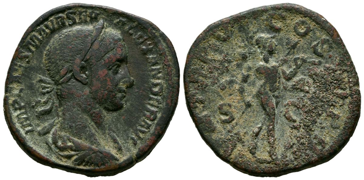 ALEJANDRO SEVERO. Sestercio. (Ae. 19,27g/31mm). 227 d.C. Roma. (RIC 456). Anv: Busto laureado y drapeado de Alejandro Severo, alrededor leyenda: IMP CAES M AVR SEV ALEXANDER AVG. Rev: Marte avanzando a derecha portando lanza y trofeo, en campo: S-C, alrededor leyenda: P M TR P VI COS II P P. BC+.