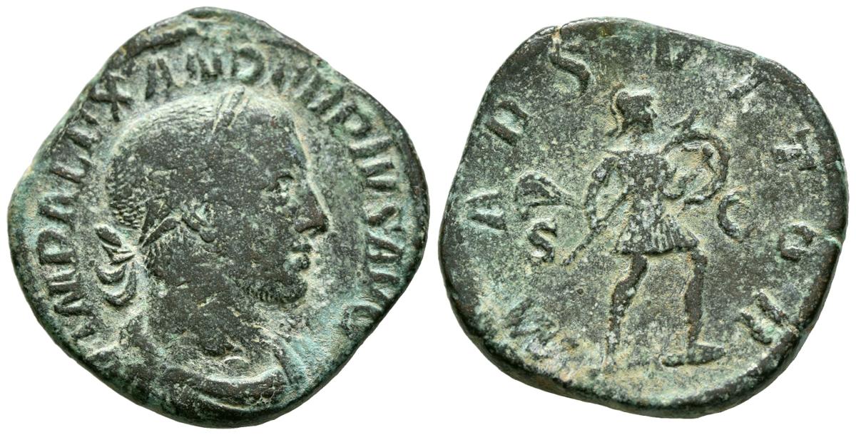 ALEJANDRO SEVERO. Sestercio. (Ae. 17,18g/31mm). 232 d.C. Roma. (RIC 635). Anv. Busto laureado y drapeado de Alejandro Severo a derecha, alrededor leyenda: IMP ALEXANDER PIVS AVG. Rev: Marte avanzando a derecha portnado lanza y escudo, entre: S-C, alrededor leyenda: MARS VLTOR. BC+/MBC-.