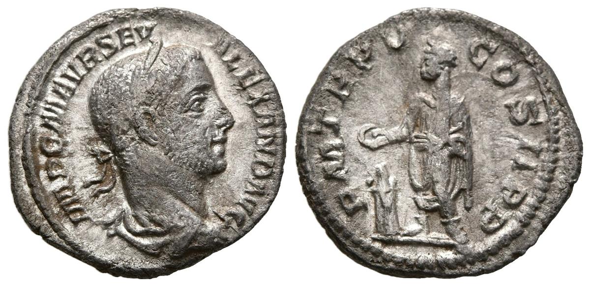 ALEJANDRO SEVERO. Denario. (Ar. 2,03g/19mm). 226 d.C. Roma. (RIC 55). Anv: Busto laureado y drapeado de Alejandro Severo a derecha, alrededor leyenda: IMP C M AVR SEV ALEXAND AVG. Rev: Alejandro Severo estante a izquierda portando patera sobre altar, alrededor leyenda: P M TR P V COS II P P. MBC.