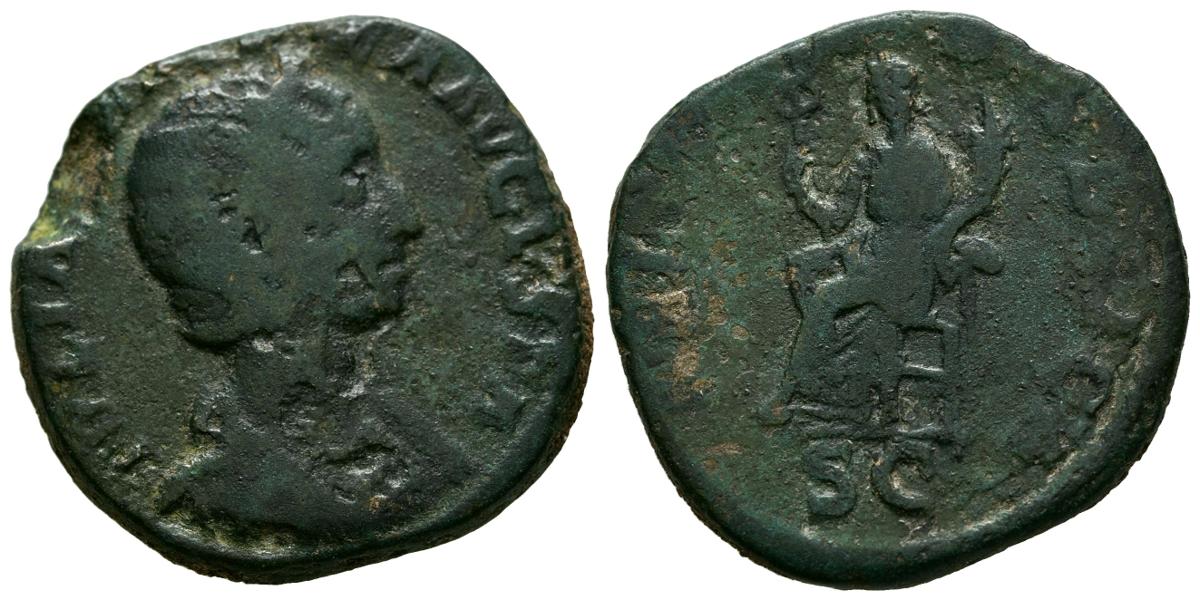 JULIA MAMAEA. Sestercio. (Ae. 14,13g/28mm). 230 d.C. Roma. (RIC 679). Anv: Busto diademado y drapeado de Julia Mamaea a derecha, alrededor leyenda: IVLIA MAMAEA AVGVSTA. Rev: Felicitas sentada a izquierda portando caduceo y cornucopia, debajo SC, alrededor leyenda: FELICITAS PVBLICA. BC+.