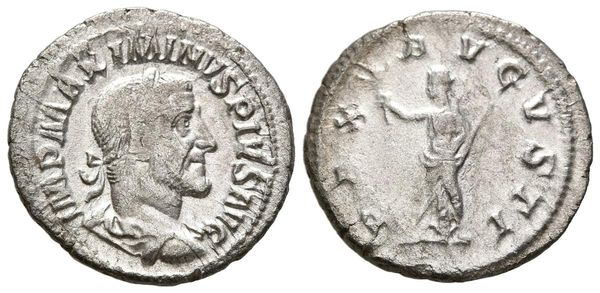 MAXIMINO I. Denario. (Ar. 3,14g/20mm). 235-236 d.C. Roma. (RIC 12). Anv: Busto laureado y drapeado de Maximino I a derecha, alrededor leyenda: IMP MAXIMINVS PIVS AVG. Rev: Pax estante a izquierda alzando mano derecha y portando cetro, alrededor leyenda: PAC AVGVSTI. MBC. Alabeado.