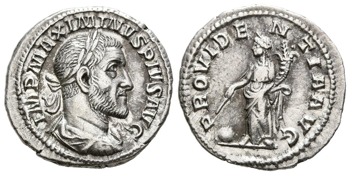 MAXIMIANO. Denario. (Ar. 2,93g/19mm). 236 d.C. Roma. (RIC 13). Anv: Busto laureado y drapeado de Maximiano a derecha, alrededor leyenda: IMP MAXIMIANVS PIVS AVG. Rev: Providentia estante a izquierda portando vara y cornucopia, a sus pies globo, alrededor leyenda: PROVIDENTIA AVG. EBC-.