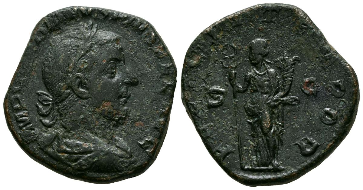 GORDIANO III. Sestercio. (Ae. 15,54g/28mm). 243-244 d.C. Roma. (RIC 328a). Anv: Busto laureado y drapeado de Gordiano III a derecha, alrededor leyenda: IMP GORDIANVS PIVS FEL AVG. Rev: Felicitas estante a izquierda portando caduceo y cetro, entre: S-C, alrededor leyenda: FELICITAS TEMPOR. MBC-. Cospel faltado.