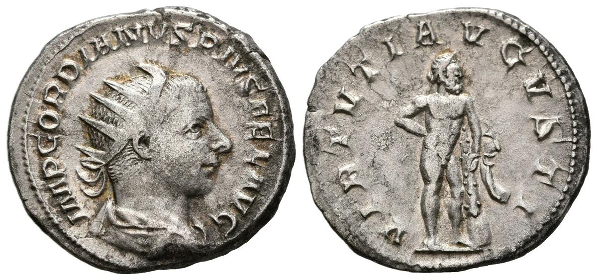 GORDIANO III. Antoniniano. (Ar. 4,42g/22mm). 241-243 d.C. Roma. (RIC 95). Anv: Busto radiado y drapeado de Gordiano III a derecha, alrededor leyenda: IMP GORDIANVS PIVS FEL AVG. Rev: Hércules estantea derecha portando mazo y piel de león, alrededor leyenda: VIRTVTI AVGVSTI. MBC.
