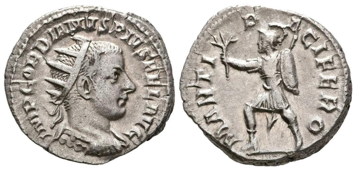 GORDIANO III. Antoniniano. (Ar. 4,68g/22mm). 242-243 d.C. Roma. (RIC 212). Anv: Busto radiado y con coraza de Gordiano III a derecha, alrededor leyenda: IMP GORDIANVS PIVS FEL AVG. Rev: Marte avanzando a izquierda portando rama y lanza y escudo, alrededor leyenda: MARTI PACIFERO. MBC+.