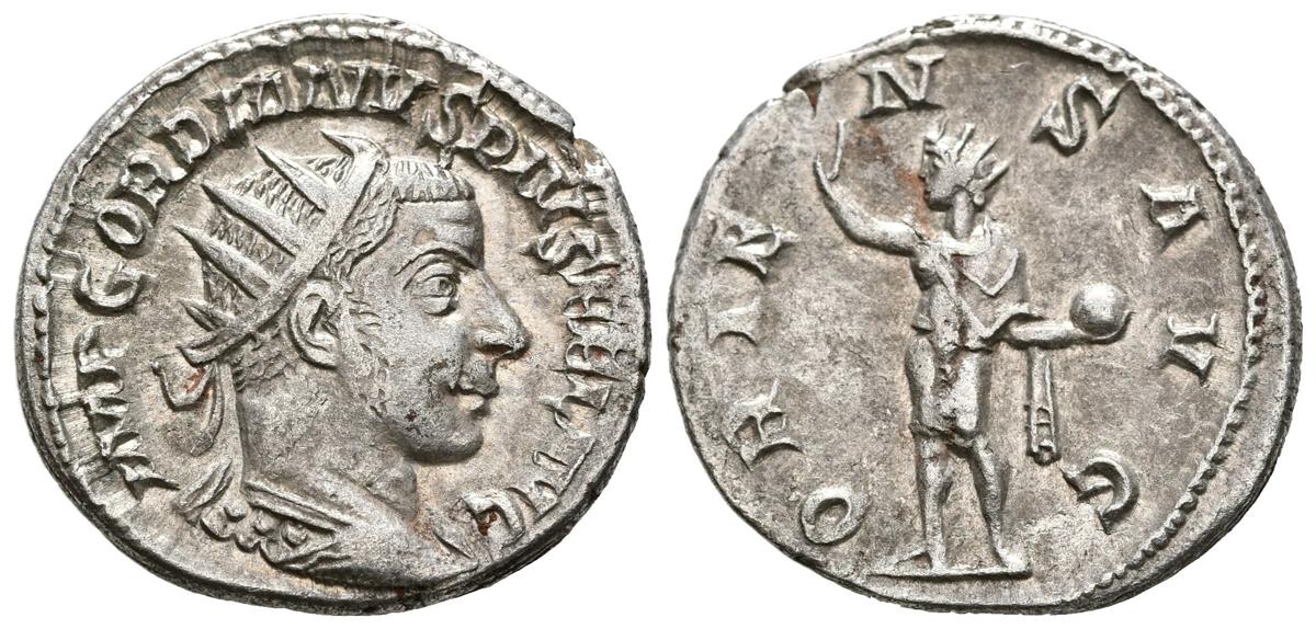 GORDIANO III. Antoniniano. (Ar. 4,29g/22mm). 242-244 d.C. Antioquía. (RIC 213). Anv: Busto radiado y drapeado de Gordiano III a derecha, alrededor leyenda: IMP GORDIANVS PIVS FEL AVG. Rev: Sol radiado estante a izquierda portando globo y alzando mano derecha, alrededor leyenda: ORIENS AVG. MBC+.