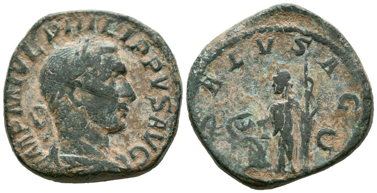 FILIPO I. Sestercio. (Ae. 19,23g/28mm). 244 d.C. Roma. (RIC 187a). Anv: Busto laureado y drapeado de Filipo I a derecha, alrededor leyenda: IMP M IVL PHILIPPVS AVG. Rev: Salus estante a izquierda portando timón y alimentando serpiente de patera sobre altar, entre: S-C, alrededor leyenda: SALVS AVG. MBC-.