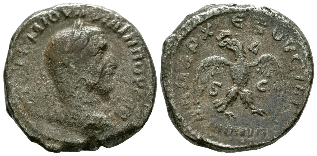 FILIPO I. Tetradracma. (Ve. 9,98g/25mm). 244 d.C. Antioquía. (Prieur 305). Anv: Busto laureado y drapeado de Filipo I a derecha, alrededor leyenda. Rev: Aguila estante a izquierda, entre S-C, en campo A, alrededor leyenda griega. BC+.
