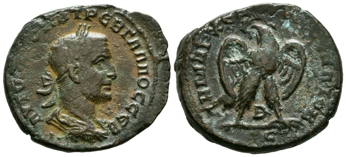 TREBONIANO GALO. Tetradracma. (Ae. 9,32g/27mm). 251-253 d.C. Antioquía. (Prieur 675). Anv: Busto laureado y drapeado y con coraza de Treboniano Galo a derecha, alrededor leyenda. Rev: Aguila estante a izquierda sobre rayo y portando corona de laurel, entre las patas D, debajo: SC, alrededor leyenda griega. MBC-.