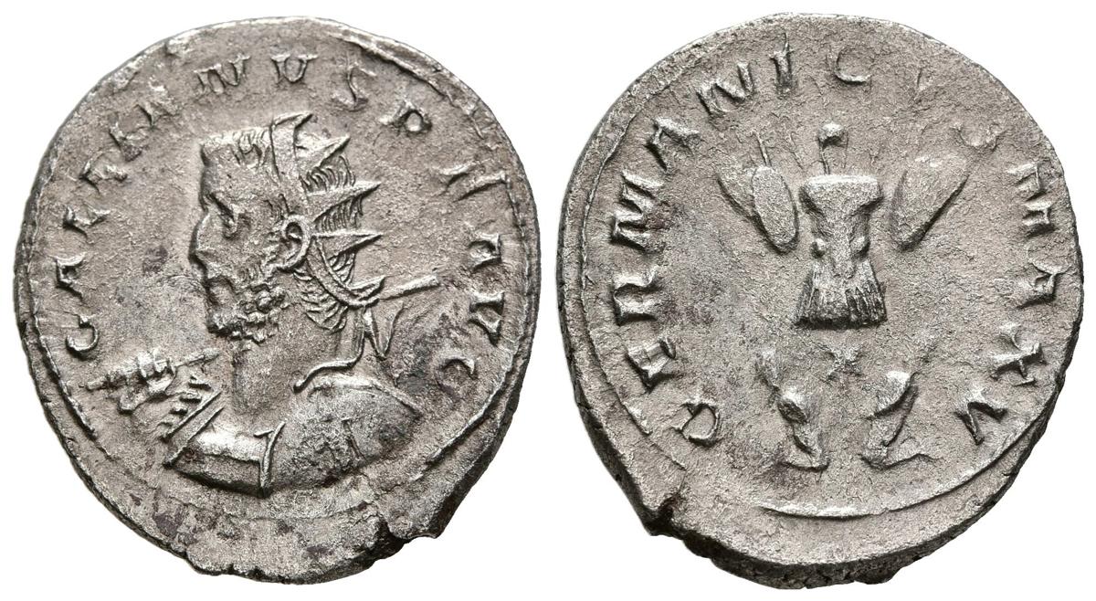 GALIENO. Antoniniano. (Ar. 3,70g/23mm). 257-258 d.C. Colonia. (RIC 18). Anv: Busto radiado y con coraza de Galieno a izquierda portando lanza y escudo, alrededor leyenda: GALLIENVS P F AVG. Rev: Trofeo entre dos cautivos, alrededor leyenda: GERMANICVS MAX V. MBC+.