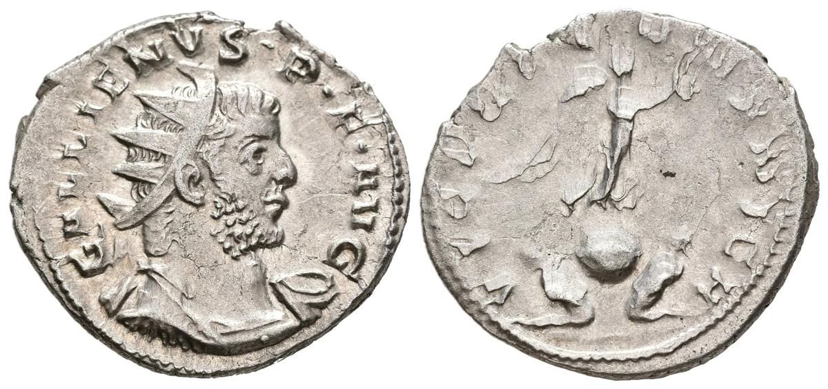 GALIENO. Antoniniano. (Ar. 3,32g/22mm). 257-258 d.C. Roma. (RIC 49). Anv: Busto radiado y con coraza de Galieno a derecha, alrededor leyenda: GALLIENVS P F AVG. Rev: Victoria sobre globo con corona de laurel entre dos cautivos, alrededor leyenda: VICT GERMANICA. MBC+/MBC.