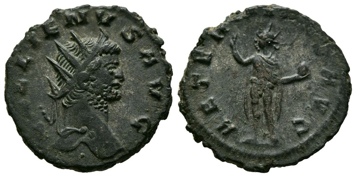 GALIENO. Antoniniano. (Ae. 3,45g/20mm). 260-268 d.C. Roma. (RIC 160). Anv: Cabeza radiada de Gallieno a Galieno, alrededor leyenda: GALLIENVS AVG. Rev: Sol estante a izquierda levantando mano derecha y globo, alrededor leyenda: AETERNITAS AVG. MBC+.
