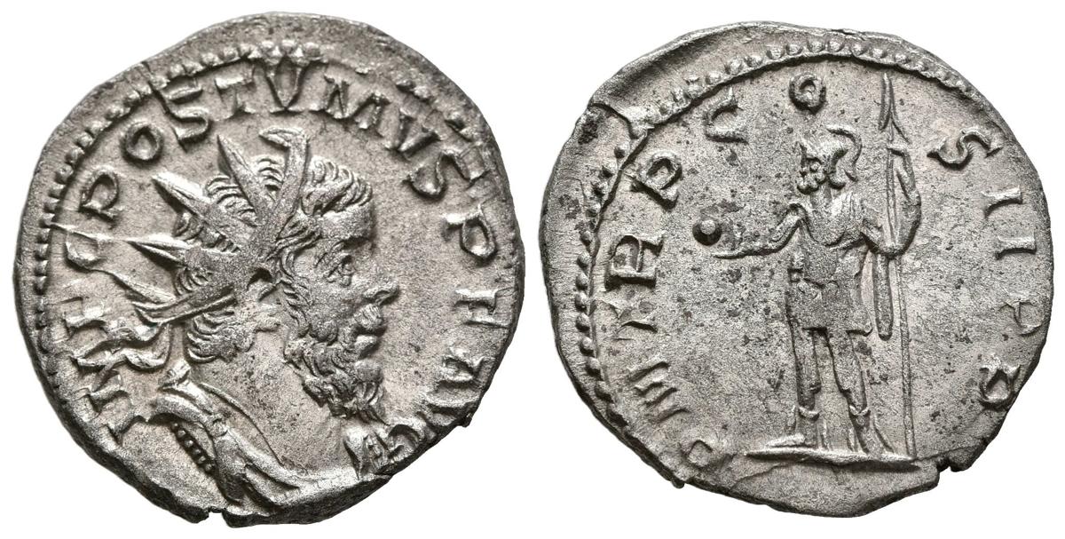 POSTUMO. Antoniniano. (Ar. 3,92g/22mm). 261 d.C. Treveri. (RIC 54). Anv: Busto radiado y drapeado con coraza de Póstumo a derecha, alrededor leyenda: IMP C POSTVMVS P F AVG. Rev: Póstumo estante a izquierda portando globo y lanza, alrededor leyenda: P M TR P COS II P P. EBC-/MBC+.