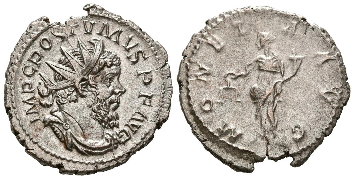 POSTUMO. Antoniniano. (Ar. 3,71g/22mm). 262-263 d.C. Treveri. (RIC 75). Anv: Busto radiado y drapeado de Póstumo a derecha, alrededor leyenda: IMP C POSTVMVS P F AVG. Rev: Moneta estante a izquierda portando escalas y cornucopia, alrededor leyenda: MONETA AVG. EBC/MBC. Cospel faltado.