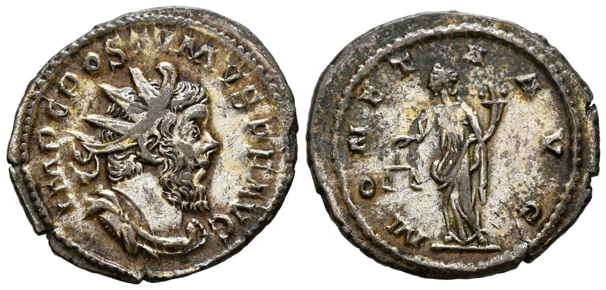 POSTUMO. Antoniniano. (Ar. 3,96g/24mm). 262-263 d.C. Treveri. (RIC 75). Anv: Busto radiado y drapeado de Póstumo a derecha, alrededor leyenda: IMP C POSTVMVS P F AVG. Rev: Moneta estante a izquierda portando escalas y cornucopia, alrededor leyenda: MONETA AVG. MBC+/MBC.