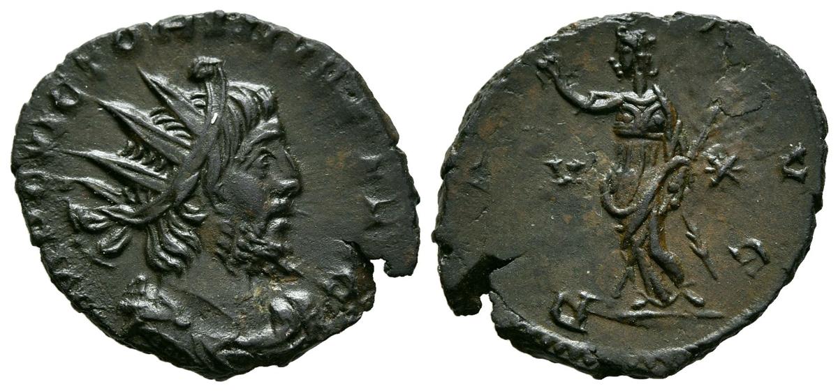 VICTORINO. Antoniniano. (Ae. 2,45g/21mm). 269-270 d.C. Treveri. (RIC 118). Anv: Busto radiado y drapeado de Victorino a derecha, alrededor leyenda: IMP C VICTORINVS P F AVG. Rev: Pex estante a izquierda portando rma y cetro, en campo V y estrella, alrededor leyenda: PAX AVG. MBC+.