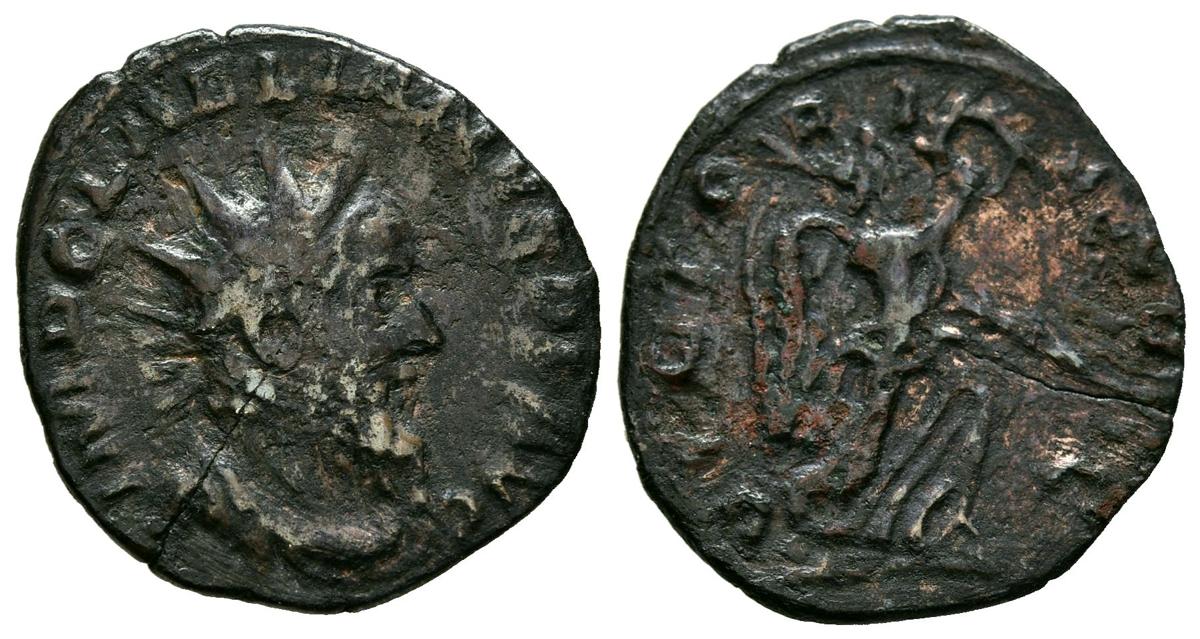 LAELIANO. Antoniniano. (Ae. 2,51g/20mm). 269 d.C. Colonia. (RIC 9). Anv: Busto radiado y con coraza de Laeliano a derecha, alrededor leyenda: IMP C LAELIANVS P F AVG. Rev: Victoria avanzando a derecha portando palma y cornucopia, alrededor leyenda: VICTORIA AVG. MBC-. Escaso ejemplar.