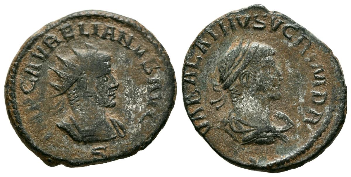 AURELIANO y VABALATO. Antoniniano. (Ae. 3,63g/21mm). 270-272 d.C. Antioquía. (RIC 381). Anv: Busto radiado y drapeado de Aureliano a derecha, alrededor leyenda: IMP C AVRELIANVS AVG. Rev: Busto laureado y drapeado de Vabalato a derecha, alrededor leyenda: VABALATHVS V C R IM D R. MBC.