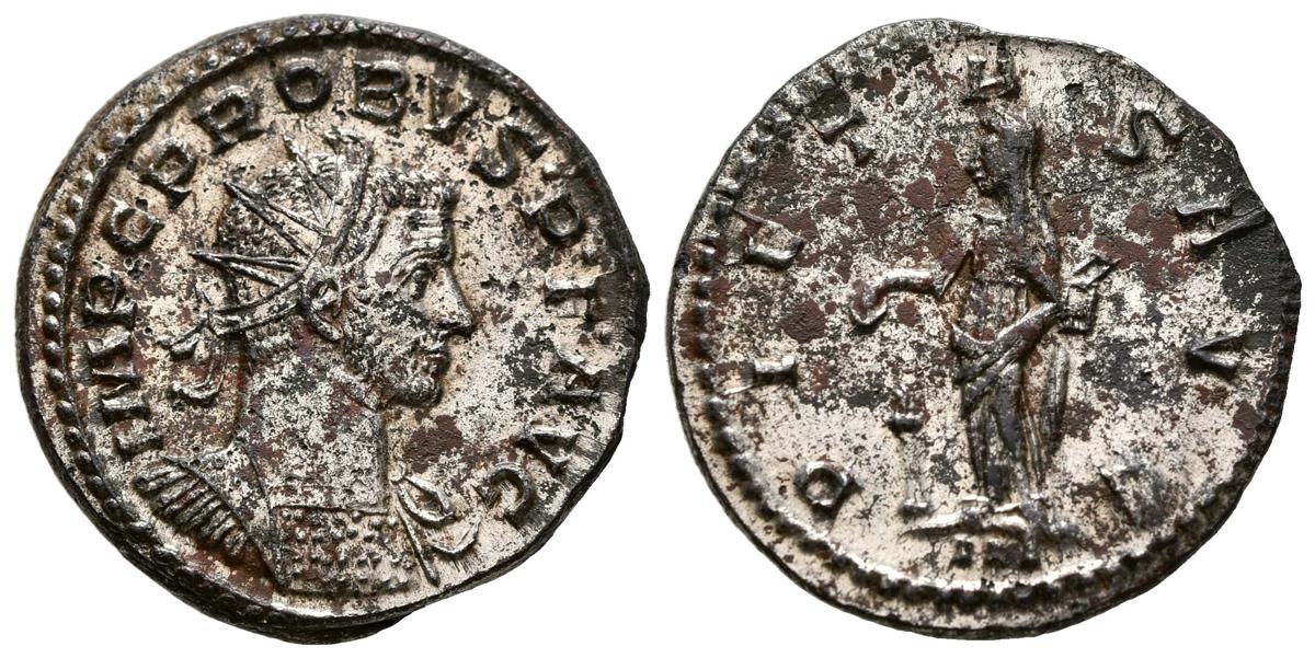 PROBO. Antoniniano. (Ve. 4,36g/22mm). 281 d.C. Lugdunum. (RIC 93). Anv: Busto radiado y con coraza de Probo a derecha, alrededor leyenda: IMP C PROBVS P F AVG. Rev: Pietas estante a izquierda portando patera y altar, en exergo: III, alrededor leyenda: PIETAS AVG. MBC+. Restos de plateado original.