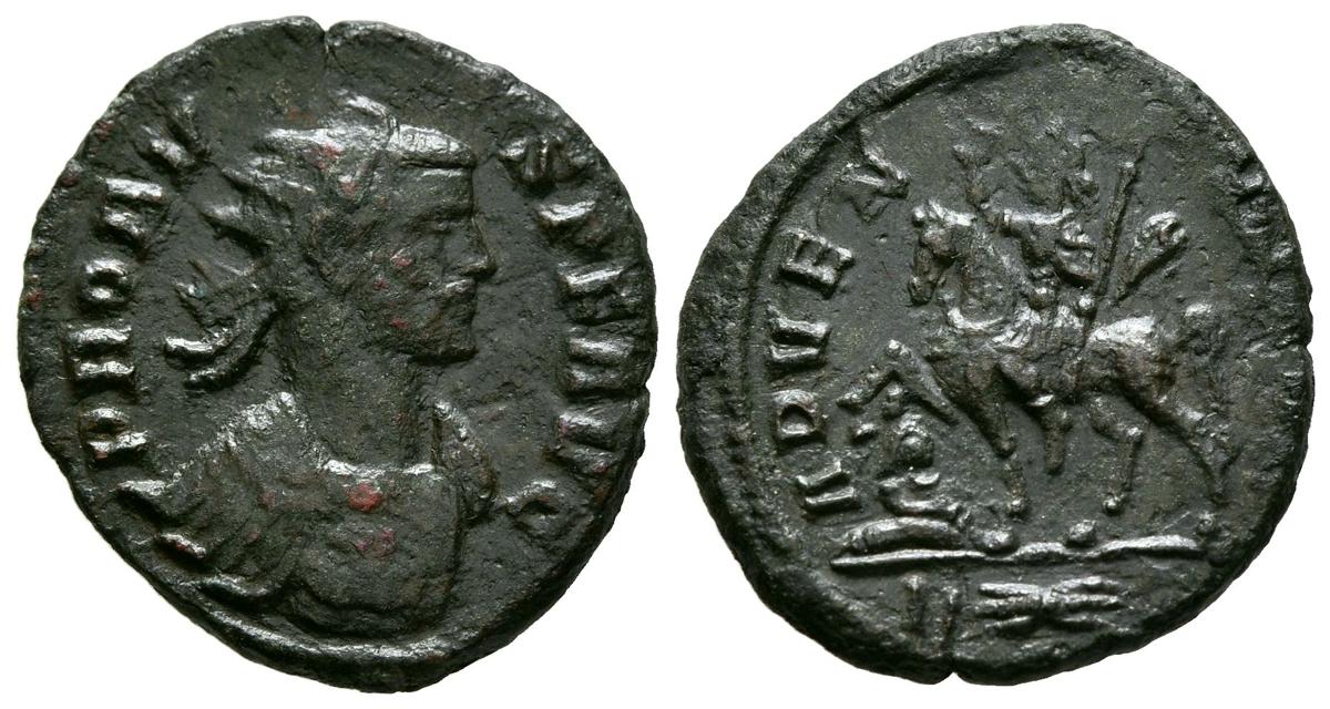 PROBO. Antoniniano. (Ve. 3,82g/21mm). 279 d.C. Roma. (RIC 158). Anv: Busto radiado y con coraza de Probo a derecha, alrededor leyenda: IMP C PROBVS AVG. Rev: Probo al paso a caballo a izquierda portando cetro y alzando mano derecha, a sus pies cautivo, en exergo: A fúlmen y r, alrededor leyenda: ADVENTVS AVG. MBC.