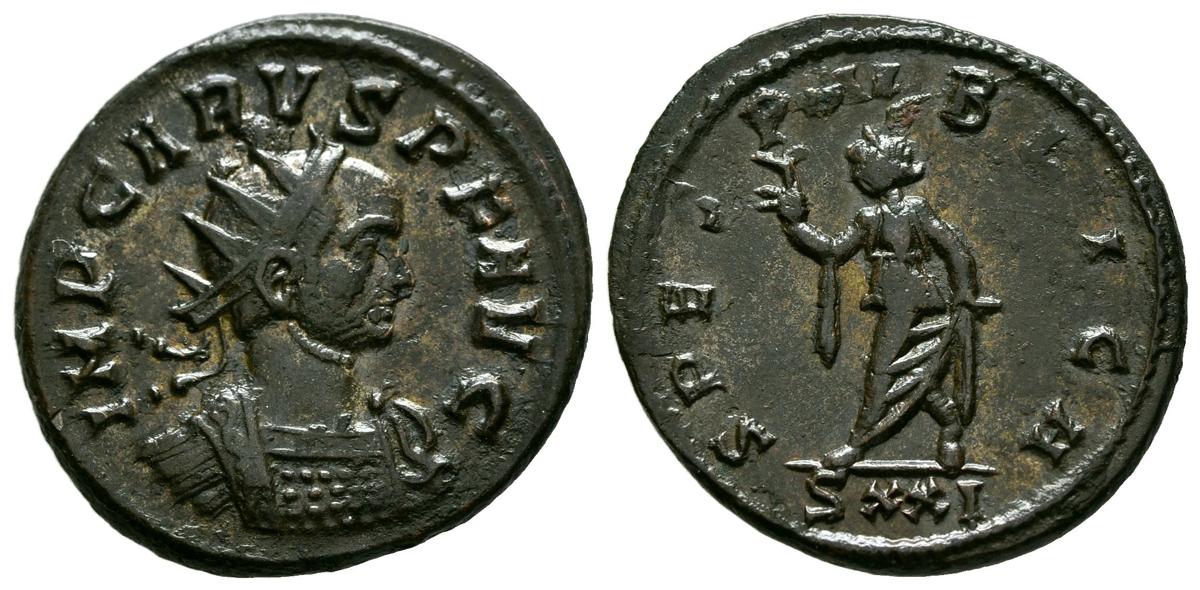 CARO. Antoniniano. (Ae. 4,22g/22mm). 282 d.C. Ticinum. (RIC 82). Anv: Busto radiado y con coraza de Caro a derecha, alrededor leyenda: IMP CARVS P F AVG. Rev: Spes avanzando a izquierda portando flor, en exergo: SXXI, alrededor leyenda: SPES PVBLICA. EBC-. Bonito ejemplar.
