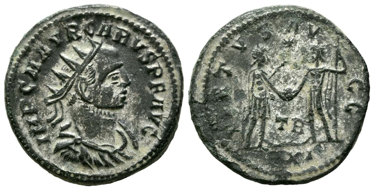 CARO. Antoniniano. (Ae. 3,91g/22mm). 282-283 d.C. Trípoli. (RIC 128). Anv: Busto radiado, drapeado y con coraza de Caro a derecha, alrededor leyenda: IMP C M AVR CARVS P F AVG. Rev: Caro estante a derecha portando cetro y recibiendo globo de Júpiter estante a izquierda portando cetro, entre ellos: TR, en exergo: XXI, alrededor leyenda: VIRTVS AVGG. MBC. Restos de plateado original.