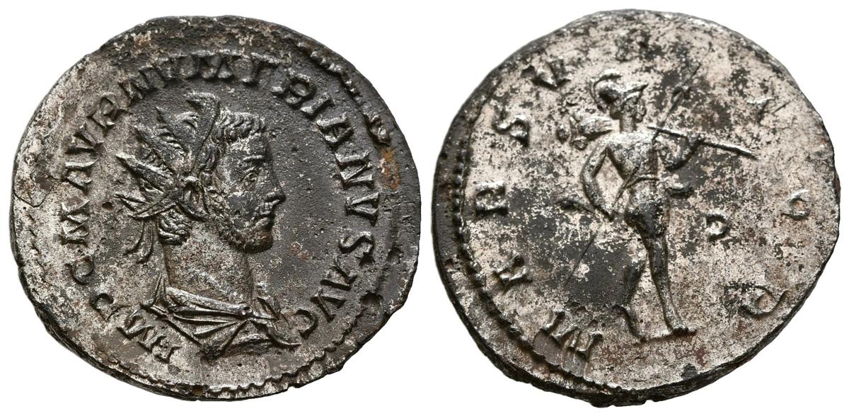 NUMERIANO. Antoniniano. (Ve. 3,63g/23mm). 283-284 d.C. Lugdunum. (RIC 386). Anv: Busto radiado y drapeado de Numeriano a derecha, alrededor leyenda: IMP C M AVR NVMERIANVS AVG. Rev: Marte avanzando a derecha portando lanza y trofeo, en campo C invertida, alrededor leyenda: MARS VICTOR. EBC. Restos de plateado original.