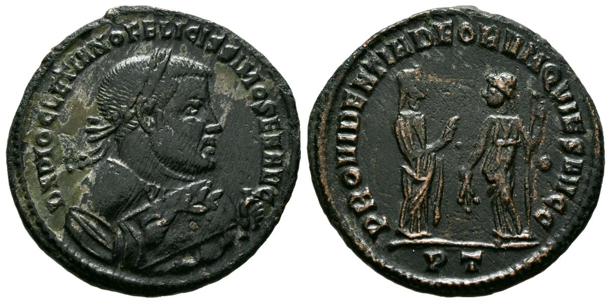DIOCLECIANO. Follis. (Ae. 8,34g/27mm). 305 d.C. Ticinum. (RIC 57a). Anv: Busto laureado y drapeado de Diocleciano a derecha portando mappa y rama de oliva, alrededor leyenda: D N DIOCLETIANO FELICISSIMO SEN AVG. Rev: Providentia estante a izquierda portndod rama y cetro, delante Quies estante a derecha, en exergo: PT, alrededor leyenda: PROVIDENTIA DEORVM QVIES AVGG. MBC+.