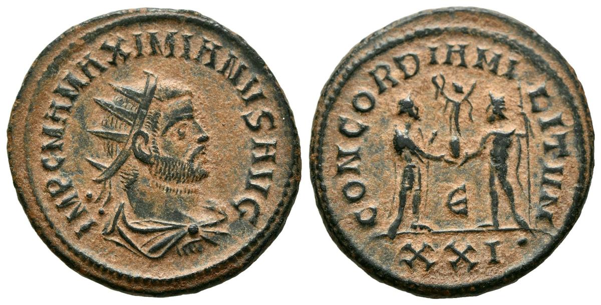 MAXIMIANO. Antoniniano. (A. 4,28g/22mm). 293-294 d.C. Cícico. (RIC 607). Anv: Busto radiado y drapeado con coraza de Maximiano a derecha, alrededor leyenda: IMP C M A MAXIMIANVS AVG. Rev: Maximiano estante a derecha recibiendo Victoria con corona de laurel de Júpiter estante a izquierda por lanza, entre ellos E, en exergo: XXI, alrededor leyenda: CONCORDIA MILITVM. MBC.