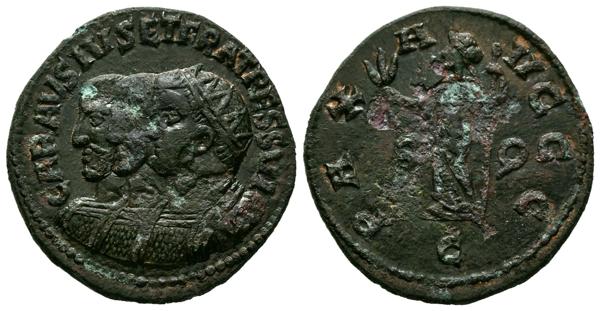 CARAUSIO. Antoniniano. (Ae. 6,06g/23mm). 286-293 d.C. Colchester. (RIC 2; Bourne 68). Anv: Bustos radiados y con coraza de Carausio, Diocleciano y Maximiano, alrededor leyenda: CARAVSIVS ET FRATES SVI. Rev: Pax estante a izquierda portando rama y cetro, entre: S-P, en exergo: C, alrededor leyenda: PAX AVGGG. MBC. Oxidaciones limpiadas.