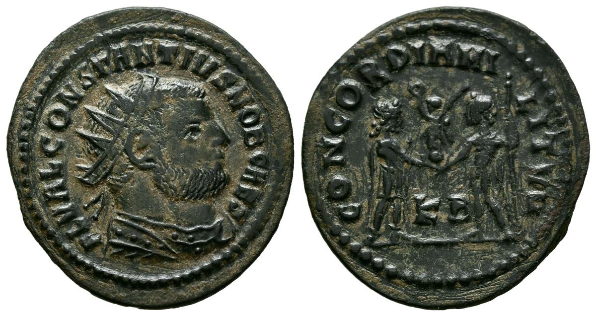 CONSTANCIO I. Antoniniano. (Ae. 3,09g/23mm). 296-299 d.C. Cícico. (RIC 19a). Anv: Busto radiado y con coraza de Constancio I a derecha, alrededor leyenda: FL VAL CONSTANTIVS NOB CAES. Rev: Constancio I recibiendo Victoria con corona de laurel de Júpiter, entre ellos: KB, alrededor leyenda: CONCORDIA MILITVM. MBC.